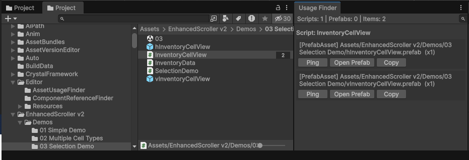 With a simple action, the tool scans your project to find all usages of a selected Prefab or Asset, including: